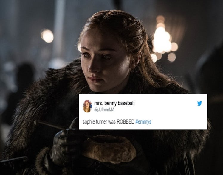 Game of Thrones fans may never be satisfied with the outcome of the battle for the Iron Throne, but the Television Academy definitely found it worth celebrating. The eighth and final season of the HBO fantasy drama received a record-breaking total of 32 Emmy nominations, including Sophie Turner's first acting nomination. However, a win wasn't in the cards for her, and tweets about Sophie Turner's 2019 Emmy snub capture a ton of emotions.