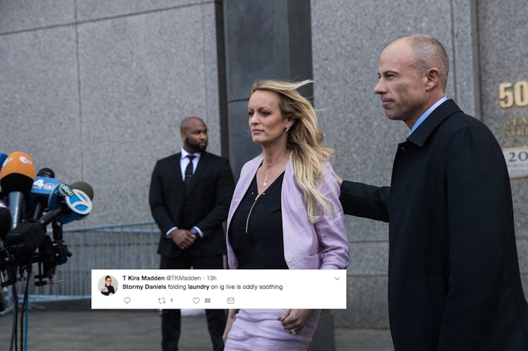 On Jan. 8, adult film actress Stormy Daniels, also known by her legal name of Stephanie Clifford, announced on Twitter that she would be Instagram live-streaming her folding laundry in her underwear at the very time of President Trump's prime-time address. For those who aren't familiar with Daniels' and Trump's relationship, here's a quick rundown: In January 2018, reports surfaced that Trump's former attorney, Michael Cohen, had had paid Daniels $130,000 to keep quiet on an alleged affair she had with President Trump in 2006. Even though Cohen later admitted to making the payment to Daniels, and later alleged that he made the payment at Trump's own direction. Trump has consistently denied all allegations of the supposed affair, and said Cohen was "lying" about being directed to make the payment. Neither White House nor representatives of Cohen responded to Elite Daily's request for comment on the matter. Plus, over the past few months, Trump and Daniels have been involved in heated legal battles between the two of them, which resulted in Daniels being ordered to pay Trump nearly $300,000 in legal fees after a judge ruled against her defamation lawsuit against the president. The White House did not respond to Elite Daily's request for comment about the lawsuit.