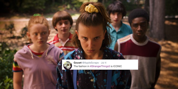 Stranger Things Season 3 is officially here, and with it comes a heaping dose of 1980s nostalgia. The new season of the hit Netflix series offers plenty of fun details for nostalgia-lovers. Amidst all the monster-fighting and conspiracy-chasing, there countless references to the '80s, from popular TV shows of the time to the short-lived '80s-era New Coke. But, there's one aspect of the '80s that Stranger Things Season 3 gets so right, fans can't stop talking about it: the fashion. These tweets about Stranger Things Season 3's fashion make it clear that fans are all about the '80s.