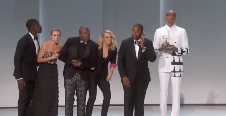 Rather than have hosts Michael Che and Colin Jost immediately greet the audience, the Emmy Awards first introduced the duo's Saturday Night Live co-stars and nominees Kate McKinnon and Kenan Thompson. Whether or not you're a fan of Che and Jost's "Weekend Update" segments, you may have been in agreement with a lot of viewers about the randomness of their hosting gig. The appearance of McKinnon and Thompson introduced a super enjoyable air as they addressed this year's Emmy Awards roster having the highest amount of diverse nominees ever. The two joked that Hollywood had "solved" its issues of inclusion. As they launched into a musical number called "We Solved It," some famous friends representing different kinds of minorities joined them. Kristen Bell and Titus Burgess hopped in on the celebration, while Sterling K. Brown, RuPaul, Ricky Martin, and "One of Each" dancers also made cameos.