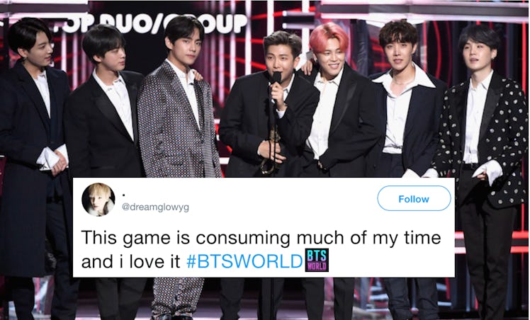 BTS ARMYs woke to a new day on June 26. That's because the new BTS World mobile game was finally released and now there's nothing to be done but obsess over it. The tweets about BTS World show ARMYs are dropping everything (school, work, basic bodily functions, eating, sleeping, and breathing) to play the highly anticipated game — which means, somewhere, J-Hope, Jimin, Jin, Jungkook, RM, Suga, and V must be high-fiving. Inducing mass fan hysteria is kind of their thing.