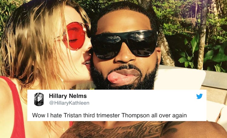 Keeping Up With The Kardashian fans are a bit overwhelmed by Season 15. In the most recent episode that aired on Sunday, Nov. 4, fans saw the entire family's reaction to the news that Tristan Thompson cheated on Khloé Kardashian. If you guys remember (as if you wouldn't...) videos surfaced of Thompson kissing other women just days before Khloé went into labor with their daughter, True. Based on the show, it looks like the reports leaked within 48 hours of True's arrival. Now, tweets about the KUWTK cheating episode are dragging Tristan Thompson so hard, you'd think it was April 2018 all over again. Elite Daily previously reached out to Kardashian and Thompson's teams for comment on the cheating scandal but did not hear back by the time of publication.