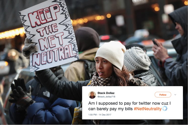 On Thursday, Dec. 14, the Federal Communications Commission (FCC) actually did it. The FCC voted to kill net neutrality, and people who use the internet (which is, you know, everyone) are really, really not happy — as proven by these tweets about the net neutrality vote. We're looking down the barrel of a very different internet, folks, and people are getting scared.
