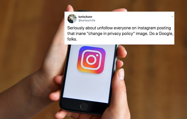 Instagram Gate 2019 is here, y'all, and it is taking its cues from a hoax that first started circulating the internet back in 2012. If you were scrolling through your feed on the evening of Tuesday, Aug. 20, chances are you saw celebrities and fellow users alike re-sharing a message that alleged to protect the poster from Instagram's new "privacy laws." Despite the fact that the text clearly contained copy-and-pasted elements, the font itself changed throughout the message, and it looks straight out of a 1995 Microsoft Word document, quite a few people (including several high-profile celebrities and politicians) fell for the doctored message and shared it on their accounts. Now that it's been debunked, these tweets about the "new" Instagram Privacy Policy show people are scratching their heads at how so many people got swept up into the hoax in the first place.