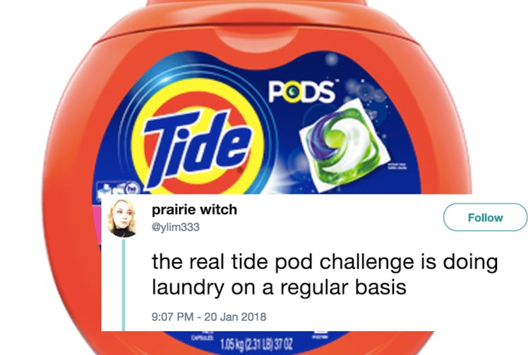 Ah, the Tide Pod Challenge. Its just another hella weird way to show that our society is quite literally crumbling beneath our feet. Most of us are beyond sick and tired of watching our nation's youth "eat" Tide Pods "for the YouTube fame" — and that population includes a hefty portion of the Twitterverse. Thankfully, a lot of those people are coming through and expressing how they truly feel about it. So in case you weren't entirely sure where everyone stands with it, these tweets about Tide Pods definitely prove that we're all just so totally over the Tide Pod Challenge.