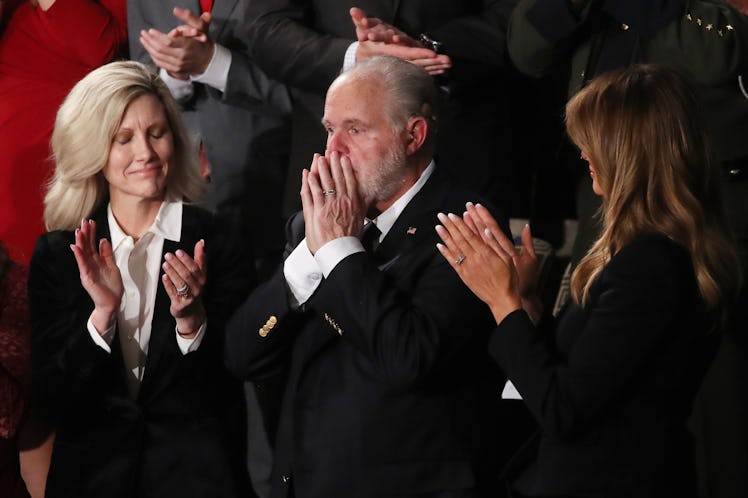 President Trump sparked controversy at the State of the Union on Tuesday, Feb. 4 when he recognized a controversial conservative talk radio host, Rush Limbaugh, with an honor previously given to the likes of Rosa Parks. Limbaugh — who revealed that he had advanced lung cancer on Monday, Feb. 3 — was awarded with the Presidential Medal of Freedom by first lady Melania Trump. It was an unprecedented move, especially considering that the host is no stranger to controversy, and these tweets about Trump giving Rush Limbaugh the Medal of Freedom at the 2020 State of the Union don't hold back. Elite Daily attempted to reach representatives of Limbaugh for comment on the criticism of him and the award on social media, but did not immediately hear back