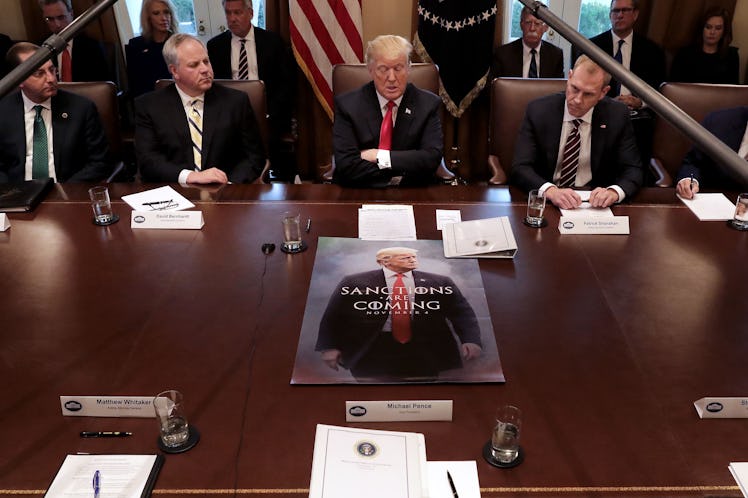 It's officially 2019, also known as the upcoming series finale of Game of Thrones. Even though the Season 8 premiere doesn't start until April, fans are eagerly waiting to see what unfolds. But if you can't wait to se who ends up on the Iron Throne, don't worry, because there's enough political drama right here. On Wednesday, Jan. 2, photos surfaced of President Donald Trump attending a Cabinet meeting with fellow political leaders. Seems pretty normal right? Well, it's what was on the table that drew everyone's attention, namely the huge 'Sanctions Are Coming' poster featuring a full-size body image of President Trump, in a clear parody of the Game of Thrones font (not to mention its semi-official tagline). Truth be told, I feel a little bit bad for those eager GOT fans. This may have drained some of the excitement a bit.