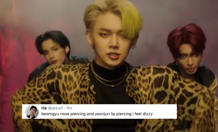 Besides the fact that the video served the epic lewks and choreo TXT fans are used to, Yeonjun was rocking a lip ring and Beomgyu was rocking a nose piercing throughout the vid. Fans couldn't get over the epic visuals, many of which included closeup footage of Yeonjun's and Beomgyu's faux piercings. MOAs made their feelings loud and clear on Twitter. Check out their reactions below.