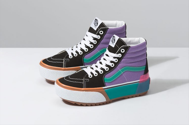 The Sk8-Hi Stacked arrives in two new palettes, each of which boasts a newly treaded and chunky sole. The Fairy Wren/Sea Green color way lives up to its name, boasting a mystical appeal; the upper is split between classic black and violet hues, with Vans' signature side stripe taking on a turquoise color. Exposed white stitching and white laces add a dose of freshness. The sole, though, is what's really whimsical. The white toe portion is flecked with silver confetti, while a semi-translucent teal overlay wraps around the back of the style. A bubblegum accent on the heel makes the shoe really pop.
