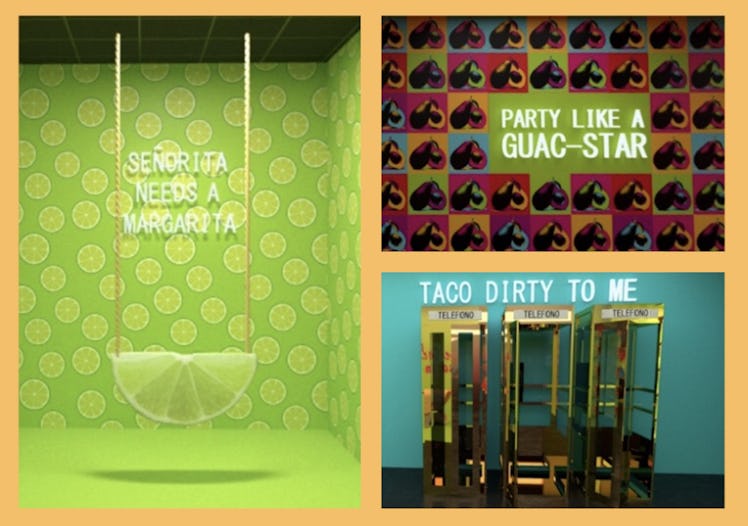 The Tacotopia pop-up — which will be open to the public in Austin, Texas for a brief stint — will feature interactive art installments that taco lovers (and margarita drinkers) will adore. According to a Feb. 19 press release by Cholula Hot Sauce, there will be over 20 different "environments" that visitors can explore inside the exhibit. The press release doesn't get into full detail about each "environment" — but based off of a sneak-peak photo from the pop-up, you can expect a lime slice swing with a backdrop that says "SEÑORITA NEEDS A MARGARITA," telephone booths with "TACO DIRTY TO ME" written above them, and an avocado wall that says "PARTY LIKE A GUAC-STAR."