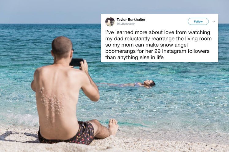 Taylor posted the hilarious images of his dad taking the Boomerang of his mom on Twitter, with the caption, "I’ve learned more about love from watching my dad reluctantly rearrange the living room so my mom can make snow angel boomerangs for her 29 Instagram followers than anything else in life.”