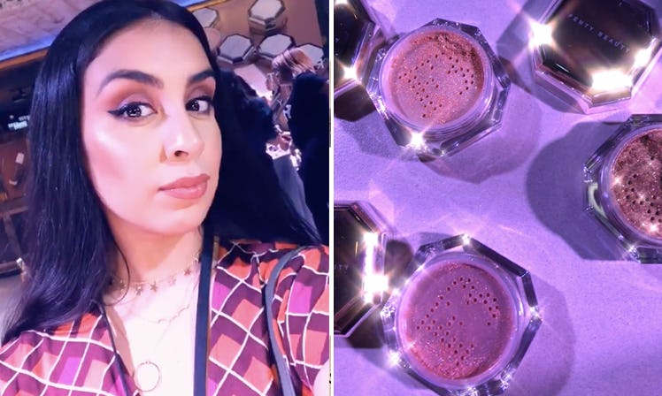 The first thing I noticed when I got to Fenty Beauty's booth (and by booth, I mean huge space with makeup stations, makeup artists, selfie stations, etc.) was this giant replica of their unreleased Fairy Bomb Shimmer Powder. It was filled with gold confetti and made for the perfect Boomerang, so naturally, I got in there and tossed some glitter around. Next, I moved on to the really good part — actually trying the product. I sat in front of the lighted mirror of my dreams and got ready to have a Fenty artist paint my cheekbones with this gold dust that glimmered in front of me.