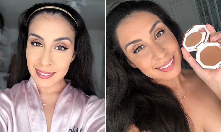 I decided to apply my makeup as usual — that's eye shadow, brows, liner, mascara, lipstick, everything — and bake it in with Fenty's PRO FILT'R Instant Retouch Setting Powder in Banana ($30; fentybeauty.com). After I brushed off the excess setting powder, my skin had a brighter cast to it with a subtle yellow undertone, and as you can see, without an ounce of tan to it. I held off on swiping on the bronzer until the very last step so I could see the bronzing power in real time.