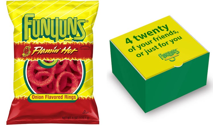 On Saturday, April 20, diehard Funyuns fans will be have a chance to win free Funyuns Snack Boxes for themselves. According to Frito-Lay, it will include bags of Original Funyuns, Flamin' Hot Funyuns, a few pairs of sunglasses, and most importantly, a couple of snack bowls, and honestly, I couldn't think of any other way I'd want to kick back and relax. To win one for you and all your friends (or just for you) all you have to do is check their Twitter and Instagram pages for instructions this weekend. The winner will be notified same-day, and will receive the prize later in the week. Regardless of how you decide to enjoy it, the complimentary Funyuns Flamin' Hot Box will definitely make for a solid weekend celebration. I can already feel it.