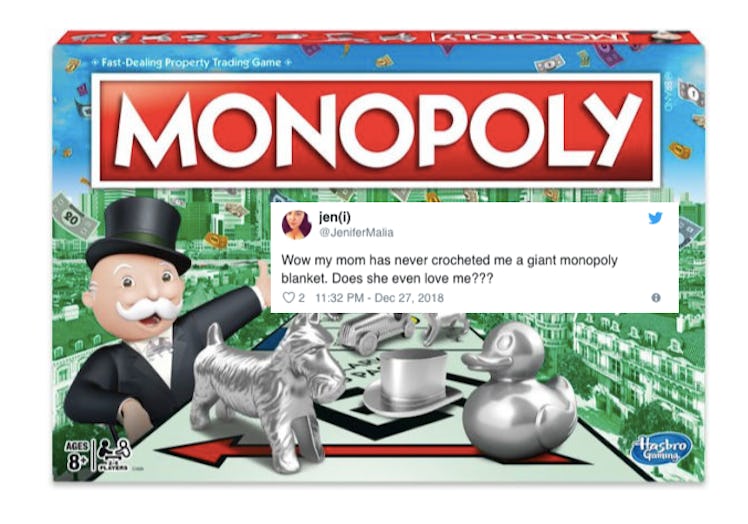 On Thursday, Dec. 27, Twitter user @pilotvirut tweeted an awesome picture of a gift they received from their mother: a hand-crocheted Monopoly blanket. Complete with each and every single residence you most likely remember from the classic board game, it even has spaces for the "Chance" and "Treasure Chest" cards, along with the Monopoly logo in the center, and — of course — the "Go" and "Jail" spaces. I've never wanted something as badly as I want this — not only for the comfort factor — but because I'm really hankering to play a giant game of Monopoly. Check out the jaw-dropping photos in their tweet, below.