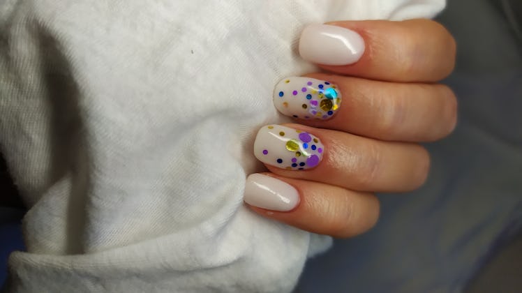 This hack is incredibly user friendly and, as nail Seattle nail artist Cassandre Banel tells Elite Daily, will not only hide the growth, imperfections, and chips, it’ll also give your manicure a whole new look. All you need for removal is glitter nail polish — Brittney Boyce, an L.A.-based nail artist, recommends using a chunkier glitter because it’ll cover the growth the best — and a topcoat polish. If you don’t have any glitter nail polish on hand, you can order Essie’s Set in Stone Nail Polish ($9, Amazon).