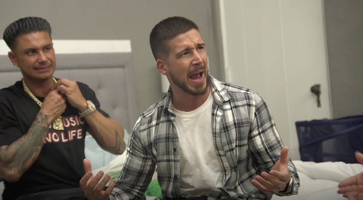 The relationship drama is in full swing yet again on the new episode of Jersey Shore Family Vacation. In the original run of Jersey Shore, hookups were part of the backdrop of the series — each episode involved the housemates picking up and "smooshing" various randos. It was fine back then because everyone was single, but in Jersey Shore Family Vacation, everyone (except Pauly D) is in a committed relationship. In Thursday night's new episode, Vinny finds himself in hot water. Elite Daily can share an exclusive Jersey Shore Family Vacation clip of Vinny's major drama from the new episode.