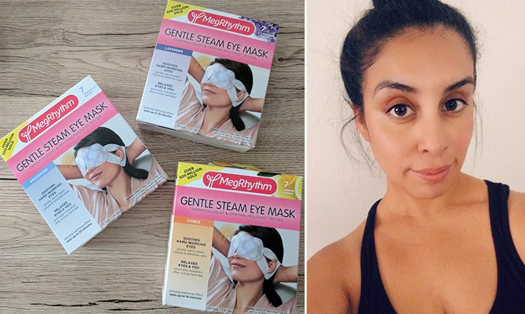 The MegRhythm Gentle Steam Eye Mask ($7; Amazon) comes in three scents: Lavender, Citrus, and Unscented. If I were getting ready for bed, I'd try the lavender, but I have a date night with my husband later so I try the citrus scent for an uplifting effect.