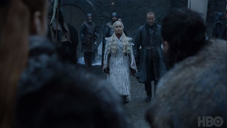 It took what felt like forever, because 2018 was the longest year in the history of time, but 2019 has finally arrived, and with it, the final episodes of Game of Thrones. All the footage HBO has kept under wraps will finally be released, first in tiny bursts of clips and pictures, and then a full-on trailer, probably toward the end of January at the very earliest. But the second tiny clip is here (the first was a brief video of Jon Snow and Sansa Stark hugging, teased late last year) as part of HBO's "What's Coming in 2019" real. This new Game of Thrones Season 8 clip gives a glimpse of one of the most highly anticipated moments from the premiere: When Jon Snow brings Daenerys Targaryen home to Winterfell. And it seems Sansa Stark is not going to be happy.
