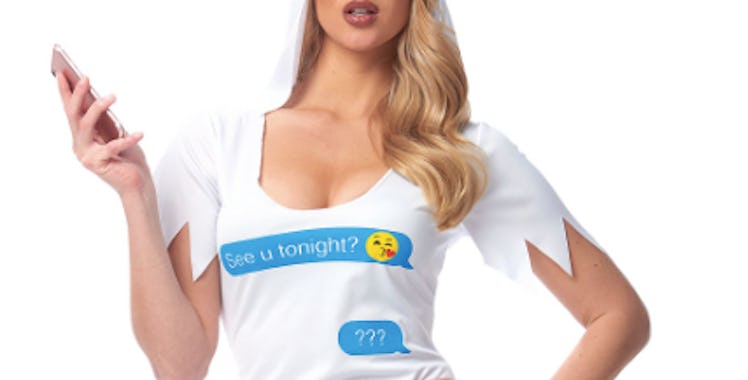 At some point in your childhood, you probably threw a white sheet over your head and called yourself a ghost. Well, Party City's "ghosted" costume is a tiny bit different (and much spookier) than the average sheet. The $25 costume is a white dress that's complete with a hood, and there are blue "text bubbles" going down the entire front side, from top to bottom. The texts appear to be from someone who seems super interested in having a conversation, but, unfortunately, it's completely one-sided. As you probably guessed, this person is getting ghosted. Party City definitely hit the nail on the head with this, as it's super relevant and highly relatable for a ton of lonely folk out there. Some might even say that it's scary relatable. *Cue spooky Halloween music.*