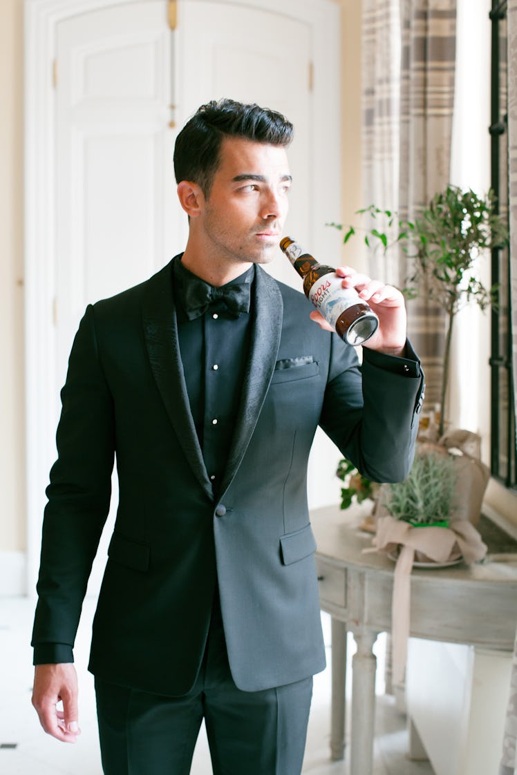 Traditionally, wedding days involve something old, something new, something borrowed, and something blue. Well, on Joe Jonas' big day, it involved something I'd consider to be very cool. You see, in this photo of Joe Jonas from his wedding to Sophie Turner, he's pictured with a truly memorable piece of his big day. It's so different, so refreshing, and honestly, so Joe and Sophie. Can you figure it out? Well, I'll save you some time. Jonas is pictured with a specially customized bottle of Coors Light. The personalized label features the words "Joe + Sophie 2019" under the Coors Light logo as well as Joe and Sophie's faces printed on the label at the top of the bottle.