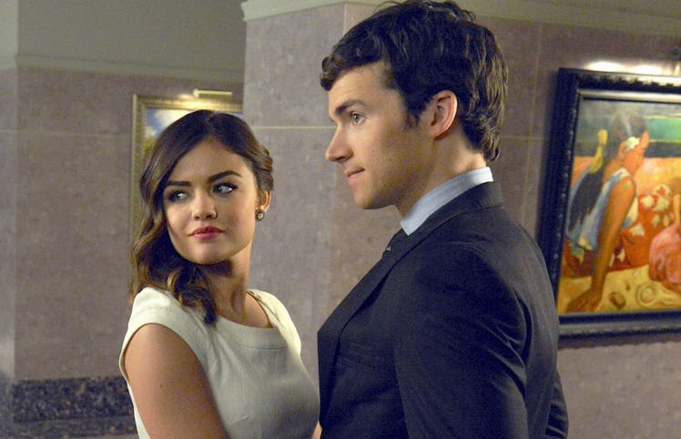 ICYMI, the Pretty Little Liars series finale concluded with newlyweds Aria (Lucy Hale) and Ezra (Ian Harding) heading off to their honeymoon. Similarly to the majority of the longtime Pretty Little Liars relationships, the two tied the knot after dancing around each other for years. It's a little icky to remember, but Ezria had their start with a make-out at the bar before learning that Ezra was Aria's new English teacher. This ship was definitely allowed to take its time before it fully sailed.