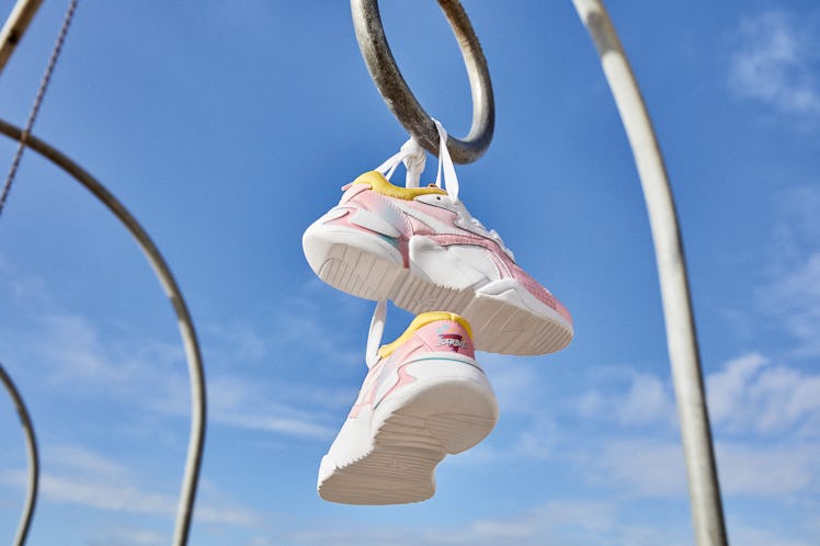 One look at it and images of a jazzercise class might come to mind. It's throwback in appearance through and through and fits in with the current dad sneaker trend in its own unique way. Grounded by a chunky white tread, the heel of which has a pink and aqua stripe rippling through it, it's definitely got that so-nerdy-it's-cool vibe. A predominantly pink upper sits atop the tread, featuring both silky and printed textiles. White laces and a two-tone tongue make the shoe even more dynamic, while thick accents of golden yellow complete the punchy style. It's a shoe that will definitely turn heads on the street, which might allow passersby to get a glance of the old school Barbie logo on each of the shoes' heels.