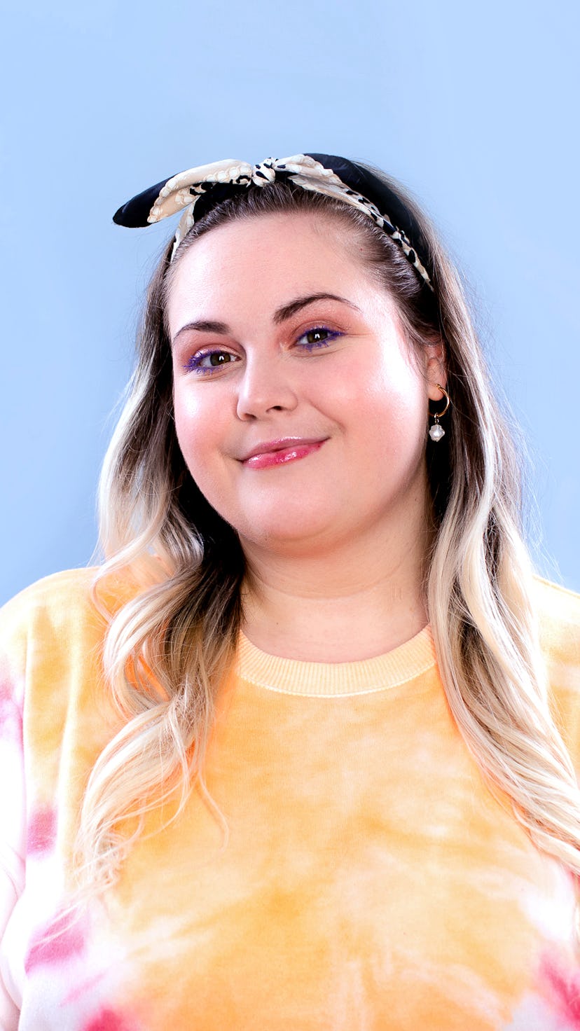 I am a violent sleeper. I know this about myself, so I sleep with my hair in a twisted top knot to protect it throughout the night, making it easier to deal with in the morning. Starting with my hair in that same, slept-in twisted top knot, I rolled up the scarf part of a Forever 21 Scarf Scrunchie ($5, Forever 21) and tied it loose around my neck. Then, I slid it up around my head like a headband to push back stray flyaways and wispy hairs around my face. For the grand finale, I let my hair down out of the top knot, fingering through the curls the twist had made to reveal bouncy, natural looking waves and curls with a cute AF headband, to boot.