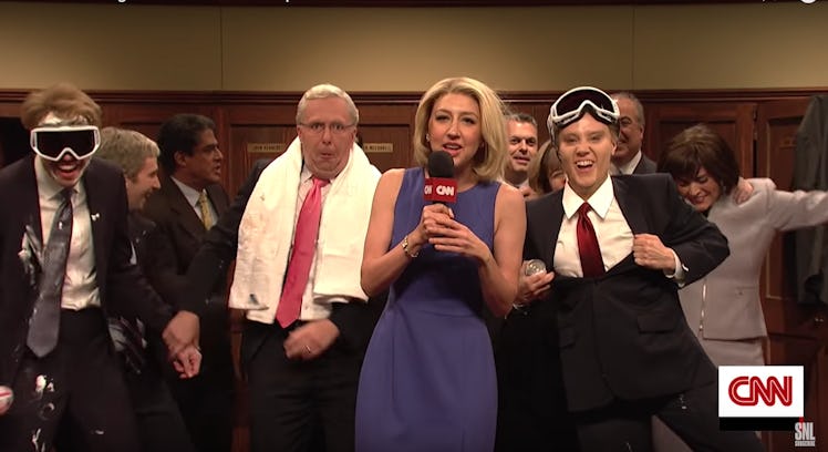 SNL decided to set the stage in a fictional locker room where CNN reporter Dana Dash (played by Heidi Gardner) interviewed the euphoric senators. To start, Senate Majority Leader Mitch McConnell (taken on by Beck Bennett) proudly told the camera, "Republicans read the mood of the country and we could tell that people really wanted Kavanaugh. Everyone's pumped — from white men over 60 to white men over 70."