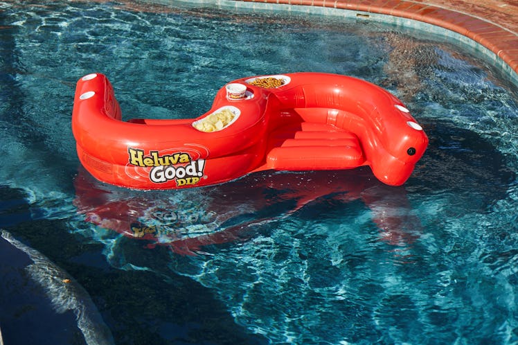 According to press materials, the people behind Heluva Good! Dip announced on Monday, July 8 that they were giving fans another way to dive into their favorite flavors this patio season with an on-theme pool float. In collaboration with *NSYNC's Joey Fatone and Lance Bass, the company is giving away 100 of these bad boys through July 29 — and you're definitely going to want to score one of these freebies for all your snacking and pool-chilling needs.