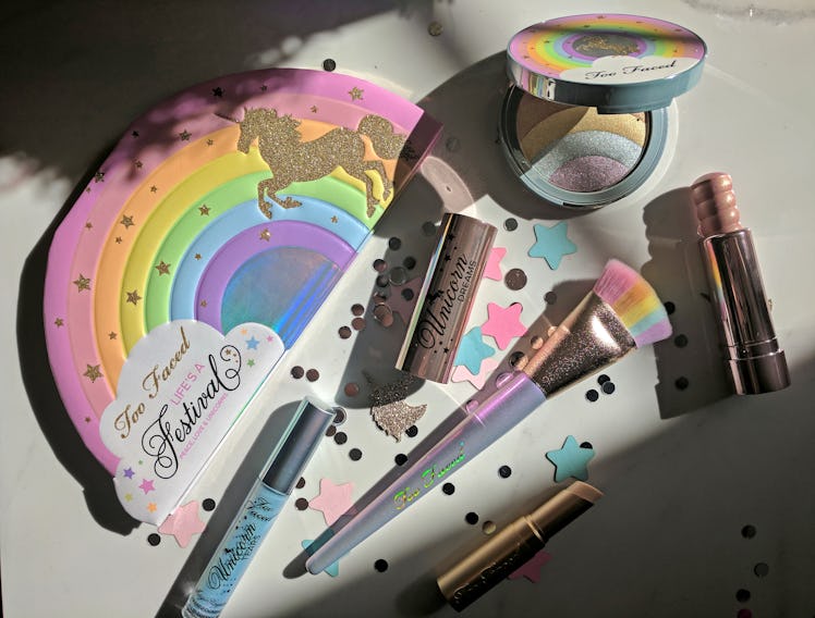 Just when you thought the unicorn makeup trend was over, a brand new collection of rainbow-colored makeup and sparkly finishes emerges — and trust me, this one was worth the wait. Ahead of its big launch, I was lucky enough to score the colorful products in order to do my very own Too Faced unicorn collection review, and I can hardly contain myself. With arms striped with glittery swatches, I'm here to walk you through the magical makeup staples before they hit Too Faced's website on Feb. 15. Brace yourself because the range includes a 13-pan palette infused with real crystals, magical color-changing lipsticks that are basically a mood ring for your lips, a rainbow highlighter, and a matching brush to stipple yourself silly.