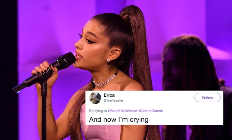 Oh no. I hate seeing anyone cry, let alone Ariana Grande. Arianators were sending their queen so much love as she broke down during a performance in her late ex-boyfriend's hometown and the footage is a lot. The video of Ariana Grande crying over Mac Miller in Pittsburgh has fans sending so many heart and sobbing emojis on Twitter and it's clear to see why. The emotional toll it must have taken for Grande to perform songs written about and inspired by her relationship with Miller, aka, Malcolm McCormick, in the place where he grew up must have been challenging.