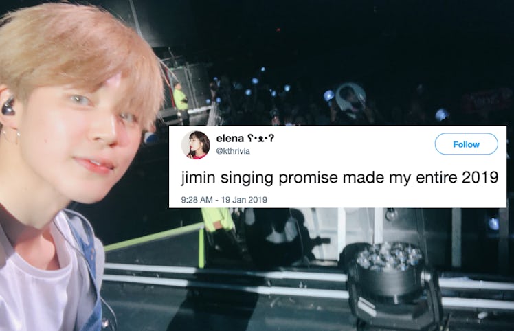 Whether they take the stage as a group or branch off for solo performances, there's no doubt that BTS is an absolute powerhouse. Along with show-stopping performances by the K-pop group at a concert on Saturday, Jan 19, Jimin took the stage alone to perform his new single. This video of BTS' Jimin singing "Promise" with fans in Singapore sounds like absolute heaven, so get ready for some serious feels.