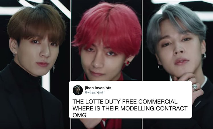 Y'ALL, a commercial starring BTS just dropped, and it's literally the sexiest thing I've ever seen. The video of BTS' Lotte Duty Free ad is about to make the entire BTS ARMY lose their collective minds, if that hasn't already started. The commercial, created for a popular Korean sopping outlet, dropped on Monday, March 4, and it shows all of the BTS boys strutting their stuff down an amazingly-lit, L-shaped runway. The commercial only lasts 15 seconds, but oh, what a glorious 15 seconds it is.