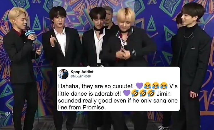 In this hectic, mixed-up world, everyone needs friends, you guys. No one knows that more than K-Pop sensation, BTS. These seven guys have each other's backs like whoa. The most recent example is in a video of BTS dancing to Jimin singing "Promise," and it has me smiling ear to freakin' ear. The boys stopped by the 2019 Golden Disk Awards where an interviewer asked Jimin to sing a little bit of his new hit single. Much to everyone's delight, his crew was there to back him up and add a little choreography. Sure, they might have been joking around, but ARMYs are eating the interaction up.