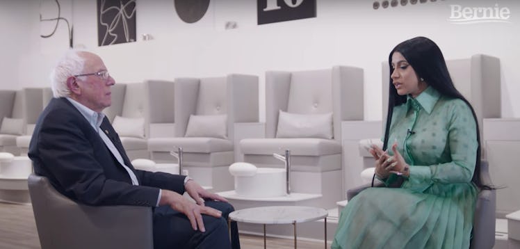 Considering that Sanders is running for the Democratic ticket in the 2020 presidential election against a slew of other candidates, it's always good to know where they stand on some of the biggest issues impacting American citizens today — and Cardi B provides a simultaneously entertaining and educational take on it when the unlikely duo met to talk at the Ten Nail Bar. On Thursday, Aug. 15, Sanders shared the full video of himself conversing with the rapper on YouTube, as the pair covered topics such as health care, minimum wage, the student debt crisis, and police violence.