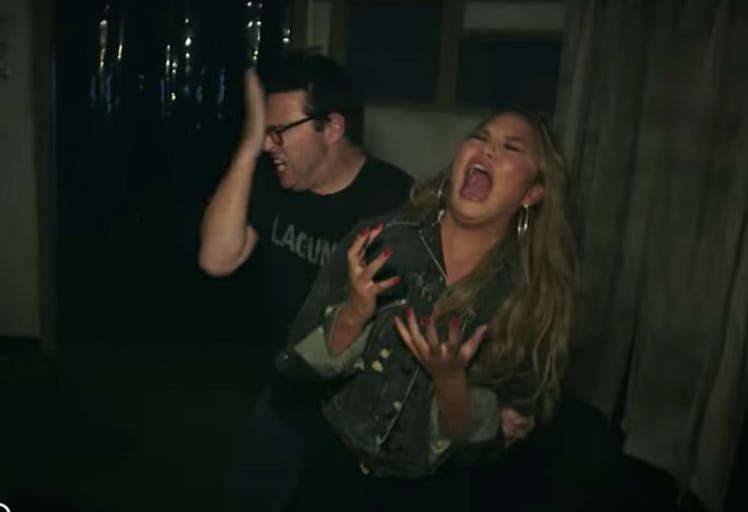 Are you in the Halloween spirit yet? Here's a simple way to find out: Do you have spooky decorations adorning your walls? Is your costume all prepped for the Halloween party? And, most importantly, are you preparing to visit a haunted house? If the answer is 'Yes' to all of the above, then congrats! You're totally ready for our spookiest holiday. It seems like our girl Chrissy Teigen is also in the mood for a frighteningly good time (yes, I will keep using Halloween puns), and this video of Ellen DeGeneres scaring Chrissy Teigen as she tours a haunted house is everything you'd ever want.