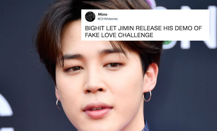 If you are a BTS fan, then you know that their song "Fake Love" is one of the most popular hits the K-Pop band has produced yet. Taken from their album, Love Yourself: Tear, it dropped on May 18 and was all about heartbreak and sorrow (insert sobbing here). But would you believe that the song could have been different from the version we know and love today? Because now, there's what appears to be a video of Jimin's "Fake Love" demo circulating on Twitter — and fans are demanding to hear the rest of it STAT. Elite Daily has reached out to BTS' team for confirmation regarding the nature of the clip, but did not hear back by the time of publication.