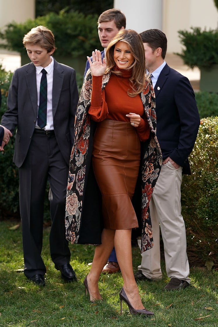 But Trump seems to be welcoming the holiday season with open arms — perhaps a needed respite (and, let's be honest, distraction) after the drama of this fall, wherein members of her husband's campaign were indicted under the FBI's investigation into Russian meddling in the 2016 election. And there's lots to be dazzled at in the newly decorated White House, replete with glitzy ornaments and a 19-foot-tall Balsam fir, one of a couple trees on display in the residence.