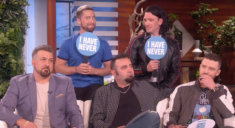 *NSYNC is back! Well, for a limited time only, but they're back. The group was honored with a star on the Hollywood Walk of Fame on Monday, April 30 (it's about time), and they made a surprise appearance on The Ellen DeGeneres Show shortly after. In the interview, airing May 1 (~it's gonna be May~), DeGeneres had the guys play a game of Never Have I Ever, and oh boy, the video of *NSYNC playing Never Have I Ever is everything the '90s fangirl in me has ever dreamed of. Justin, why did you break up the group?! Why?! I could've lived without "Cry Me A River" if it meant *NSYNC stayed together!