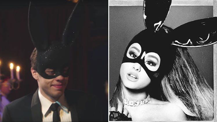 In the sketch, there's one point where the SNL cast is having some kind of masquerade ball. We see a ton of notable stars sporting traditional face masks, but then, the camera zooms in on Pete Davidson. And do you want to take a guess at what our dear friend Pete is wearing? I'll tell you what he's not wearing: a regular masquerade-style mask. Instead, Davidson is sporting a BUNNY EAR MASK that shares an uncanny resemblance to Ariana Grande's mask that she wears on the cover of her Dangerous Woman album.