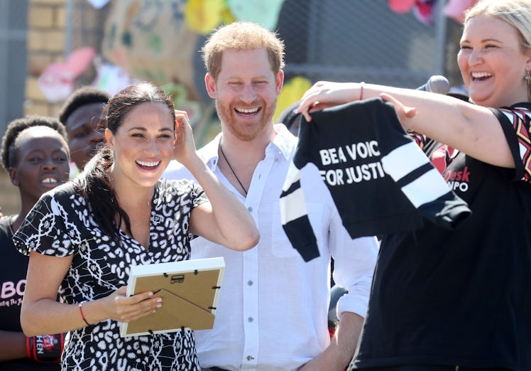 If there's one thing I've learned about marriage from watching Meghan Markle and Prince Harry, it's that you should marry a guy who knows his way around a ponytail. No, really. See, the Duke and Duchess of Sussex arrived in South Africa on Sept. 22 for their royal tour, and Prince Harry's very first order of business seemed to be attending to his wife's tresses just before a photo opp. Have you seen the video of Prince Harry fixing Meghan Markle's hair? It's incredibly adorable, you guys. I mean, not only did Meghan marry a prince, but it turns out, he's also a one-person glam squad!