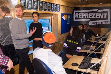 Prince Harry and Meghan Markle made an appearance at POP Brixton to meet with radio show Reprezent 107.3 FM. It's a super popular show with younger demographics in London, so they wanted to learn more about it. As they were leaving, everyone in the radio station was lined up to say goodbye to the couple. As they walked by, one DJ handed Prince Harry his business card. Harry looked it over for a second wondering what it was, then the DJ, Jevanni Letford, pipes in and says, "DJ at your wedding!" You can see Harry and Markle cracking up at the gesture as they walk out of the station.