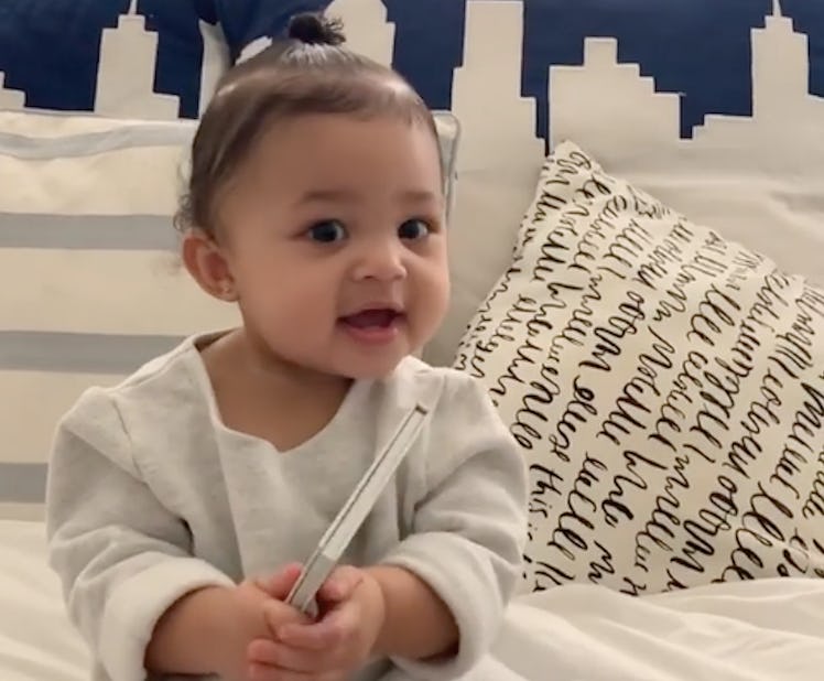 Stormi Webster is an excellent baby. The little 9-month-old cutie is starting to learn how to talk, so while she's in this learning phase, Mama Kylie is trying to teach her some important buzzwords. And the video of Stormi saying "Dada" while Kylie Jenner is trying to get her to say Kylie Cosmetics is a classic.