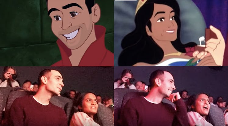 Hello. If you thought you'd gotten your fill of cuteness for today, I'm here to tell you that you're wrong. Sorry! Soon-to-be-married filmmaker Lee Loechler (sorry, spoiler, she said yes!) has basically ruined proposals forever with his viral Sleeping Beauty proposal to his high school sweetheart, cardiologist Sthuthi David, and it was a literal fairy tale moment. In case you haven't watched it, he hacked the scene where Prince Phillip revives Aurora with true love's kiss so that animations of himself and David appeared as the two protagonists. In the video, animated-Loechler "tossed" real-Loechler the ring box, and real-Loechler got down on one knee to propose. Yes, this really happened and there's video proof.