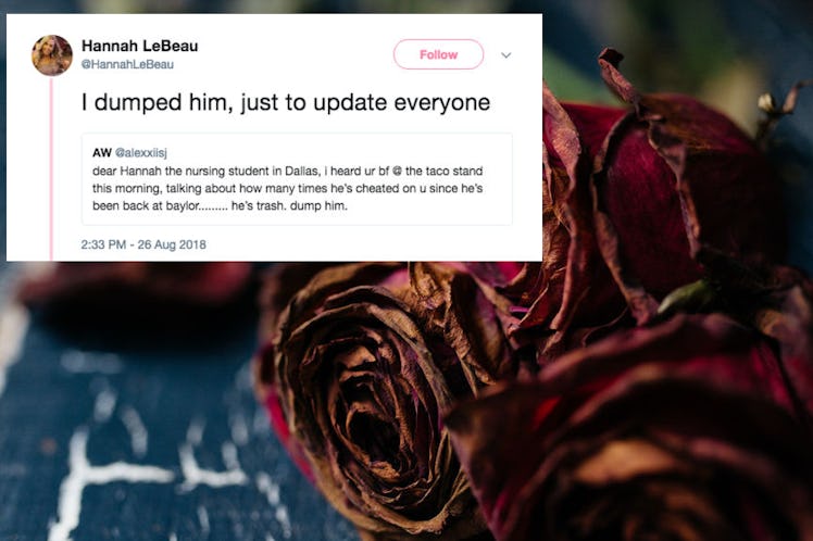 Much to the world's surprise, the tweet actually made its way over to the guy's girlfriend, Hannah LeBeau, who responded by saying "I dumped him, just to update everyone." Ah, girl power is well and alive, people! Let us REJOICE. (Elite Daily has reached out to LeBeau for comment.)