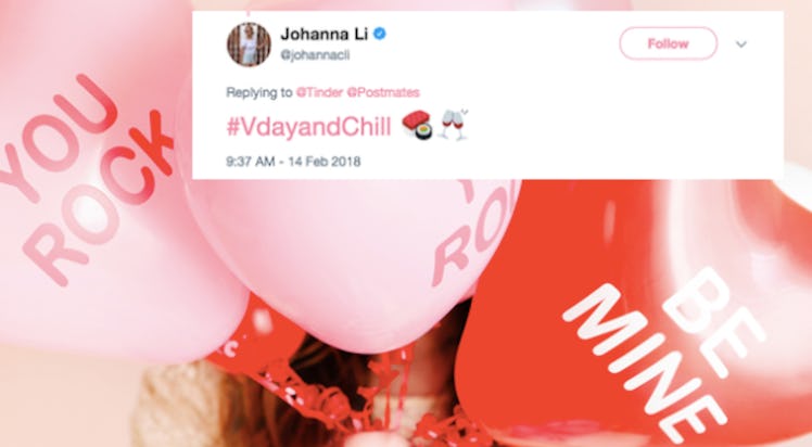 Starting at 6 a.m. PST on Valentine's Day, Twitter users could tweet whatever their hearts desired to @Tinder and @Postmates, using the hashtag #VDayAndChill and a string of emojis. (Follow both handles, too.) So, want a drink? Tap that wine emoji. Need a kiss-proof matte lipstick for tonight's make-out sesh? Send a lipstick emoji. A bunch of lucky winners already had their V-Day emoji essentials delivered to them by Postmates.