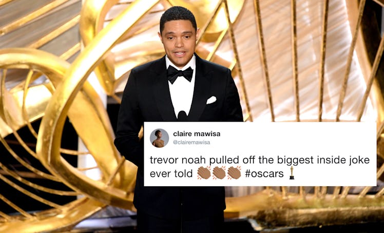 Since the Oscars did not have an official host this year, it was up to the various presenters to fill the night with jokes, and they totally delivered. Tina Fey, Amy Poehler, and Maya Rudolph kicked off the ceremony with a bunch of silly puns, and comedians like Awkwafina, John Mulaney, and Keegan-Michael Key kept the laughs coming as the night went on. But one of the funniest jokes of the night probably flew over the heads of most of the viewers. Trevor Noah's Black Panther Oscars joke in Xhosa was only for the people watching who can speak Xhosa.