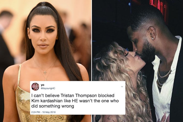 You may have guessed already that things aren't exactly peachy between Kim Kardashian and Khloé Kardashian's bae, Tristan Thompson, after he allegedly got caught smooching other women while Khloé was busy growing a baby in her womb. As Khloé's big sis, Kardashian is obviously pretty protective, straight-up admitting the whole situation is "so f*cked up" on Ellen. But overall, she's been keeping things pretty civil publicly for the sake of Khloe's new baby, True. But in a truly shocking twist, it's Thompson who just drew the line in the sand. That's right: Tristan Thompson blocked Kim Kardashian on Instagram.