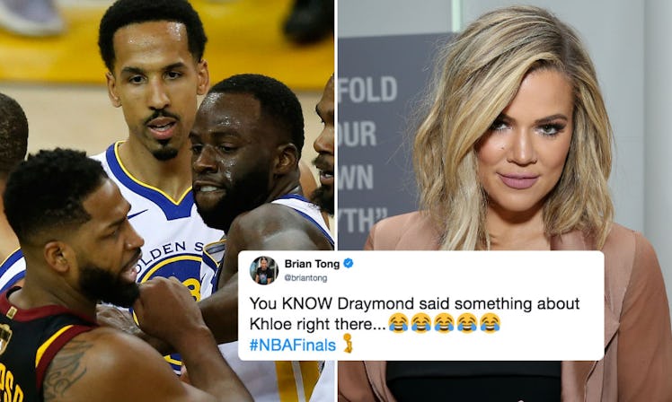 The Tristan Thompson cheating saga continues. As you all know, the 27-year-old NBA player allegedly cheated on his longtime girlfriend and mother to his daughter, Khloé Kardashian, while she was pregnant. On Thursday, Thompson was thrown out of Game 1 of the NBA finals and fought with Golden State Warriors player Draymond Green on his way out. And, obviously, fans made it the altercation all about Khloé. The truth is, Tristan Thompson's NBA final's fight technically wasn't about the drama between him and Kardashian, but I like to think his pent-up aggression is. Elite Daily reached out to Thompson and Kardashian's team for comment on the cheating rumors but did not hear back by the time of publication.